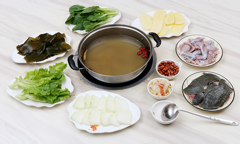 甲魚一只、牛蛙兩只、送蔬菜四盤、小菜二碟、米飯隨意